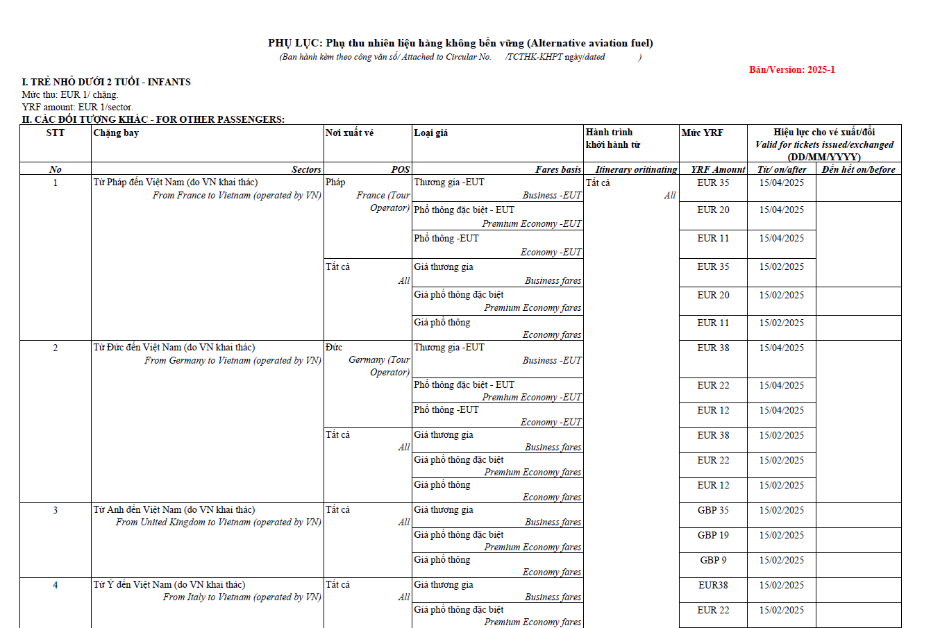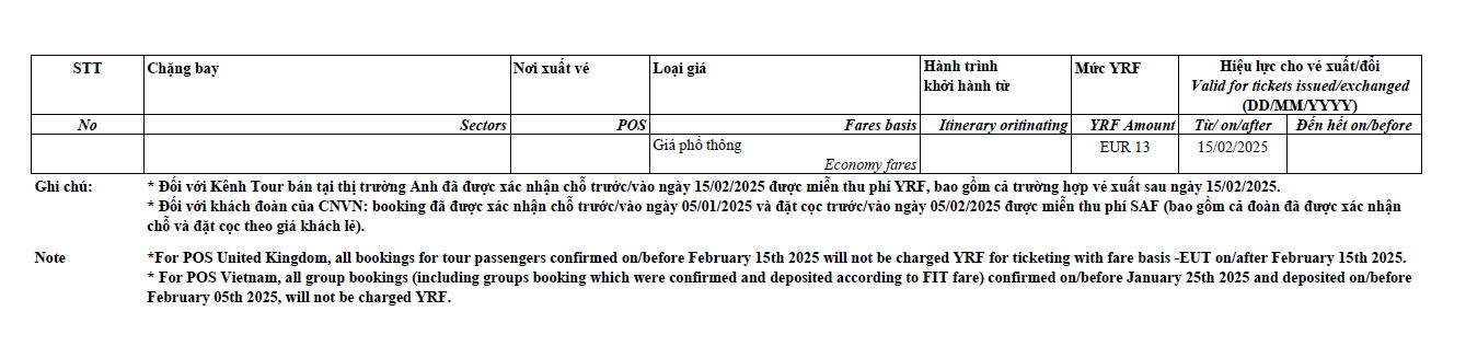 Değerli Acentelerimiz Önümüzdeki yıl için hepinize en iyi dileklerimizi sunuyoruz. Vietnam Havayolları uzun yıllardan beri daha ekolojik bir endüstri için çalışmaktadır. Vietnam Havayolları tarafından Avrupa'dan Vietnam'a gerçekleştirilen tüm uçuşlarda yeni bir Alternatif Havacılık Yakıtı (YFR) vergisi uygulanacaktır. VERGİ'nin uygulanmasına ilişkin belgeyi aşağıda bulabilirsiniz: - Fransa / Almanya / İtalya / Birleşik Krallık'tan VN uçuşları, - Ücret aralığı (VN taşıyıcı ücretleri + Tüm nego ücretleri // BT ücretlerinin farklı uygulama tarihleri vardır), - Tutarlar Business Class / Premium Economy Class / Economy Class ve Vietnam Airlines uçuşlarının kalkış ülkesine göre değişir.   Saygılarımızla, APG HAVACILIK VE TURİZM LTD STI