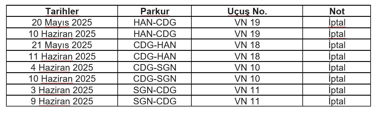 Değerli Acentelerimiz, Mayıs & Haziran 2025 tarihlerindeki HAN/SGN-CDG-HAN/SGN uçuşlarından bazılarının aşağıdaki şekilde iptal edileceğini bildirmek isteriz.  Vietnam Havayolları ile ilgili sorularınız ve daha fazla bilgi almak için 0212 334 29 40 numaralı telefondan ofisimizi arayabilir ve groups@apgturkiye.com adresimizden mail yoluyla bize ulaşabilirsiniz. Saygılarımızla , APG HAVACILIK VE TURİZM LTD STI